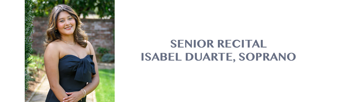 Soprano, Isabel Duarte '26 is a biology and music major from Washington, DC. Her senior recital will open with JS Bach's solo cantata, "Ich bin vergnügt mit meinem Glücke," followed by Norina's colorful aria, "So anch'io la virtù magica" from Don Pasquale. After singing selections by Schumann, Strauss and Brahms, she will perform John Corigliano's rarely heard song cycle, "The Cloisters." Her recital will conclude with songs in French by Amy Beach and Claude Debussy. Duarte is a student of Dr. Gregory Parker.